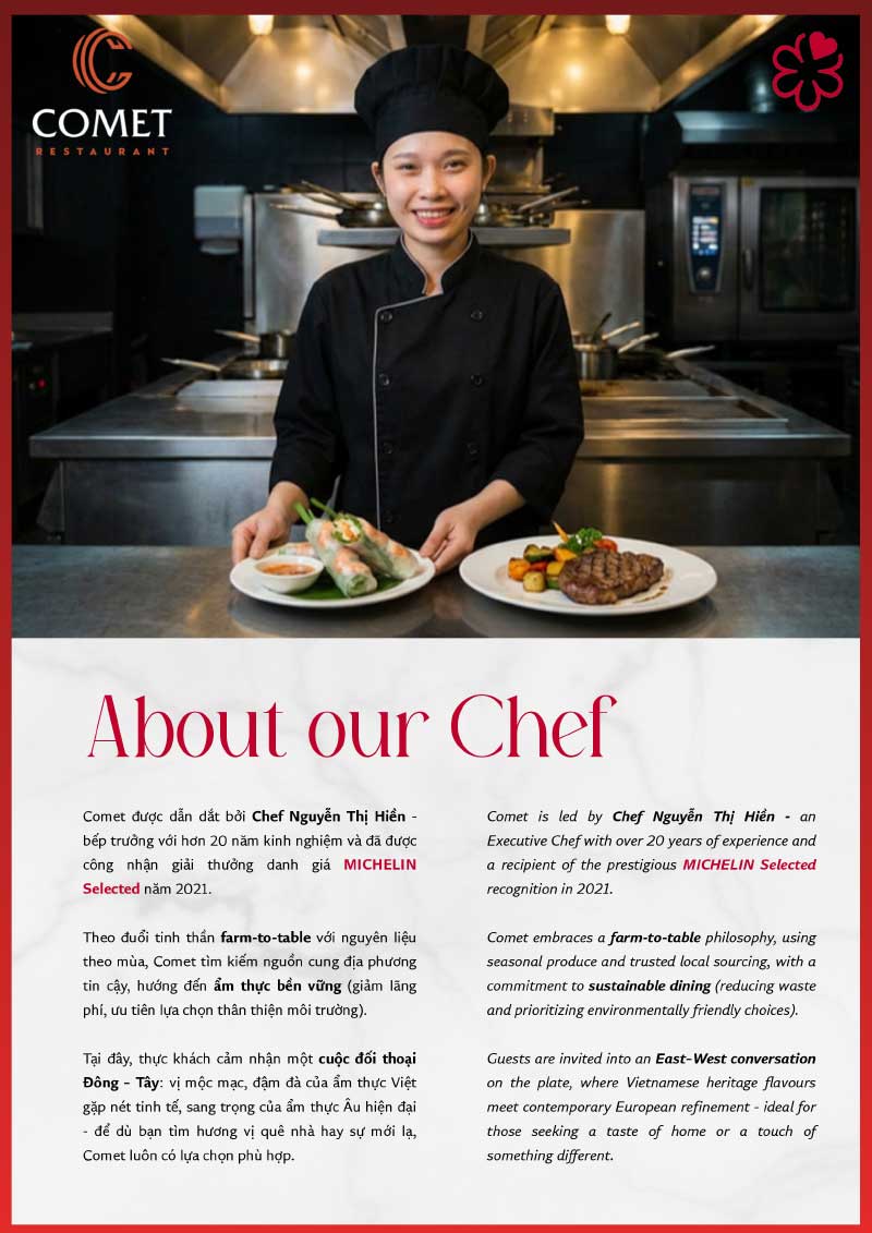 With the stunning view to the heart of Hanoi – Hoan Kiem lake, Comet Restaurant offers the unique ambiance of delicious food, contemporary western design and excellent customer service. The menu is a perfect blend of Vietnamese and fusion food, together with matching wine and drinks. The capacity of 52 seats, serving from international standard breakfast buffet to professional A la carte lunch and dinner, Comet Restaurant will create a memorable dining experience for the guests to feel the real Vietnamese cuisine.