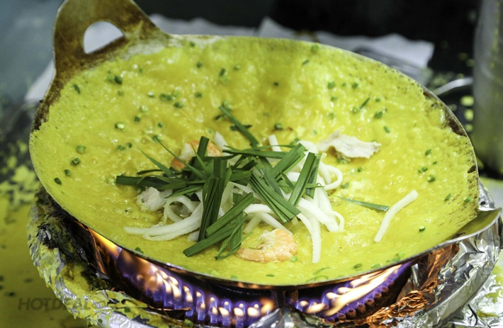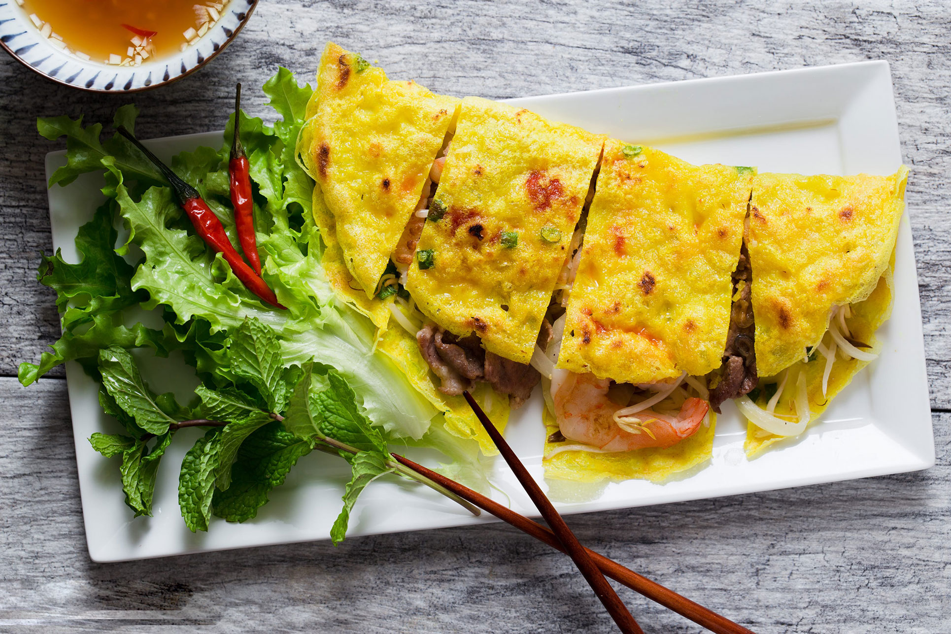 Bánh xèo (pronounced BAN-sew) is a popular street food in Vietnam. Each region brings a slight variation to the same theme of stuffed thin pancake. In the South, Bánh xèo is larger and made with more veggies and mung beans. While in the Central region, they tend to be made smaller and without mung beans.